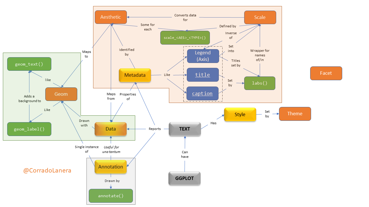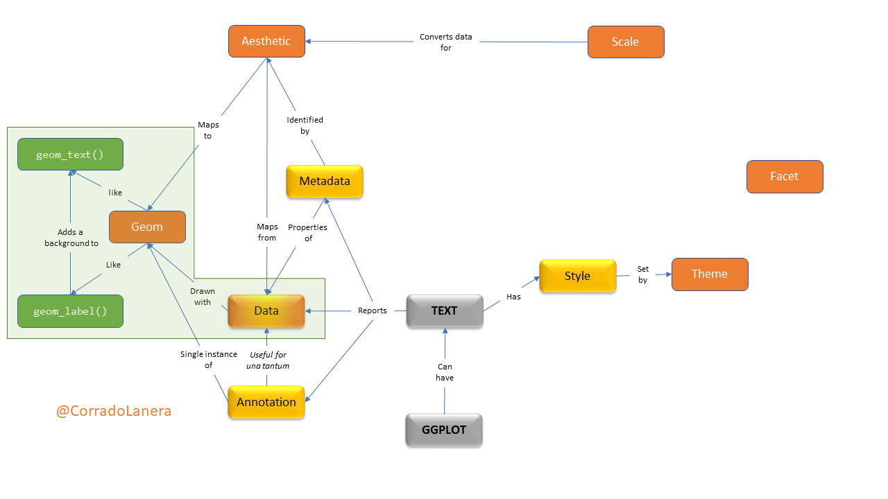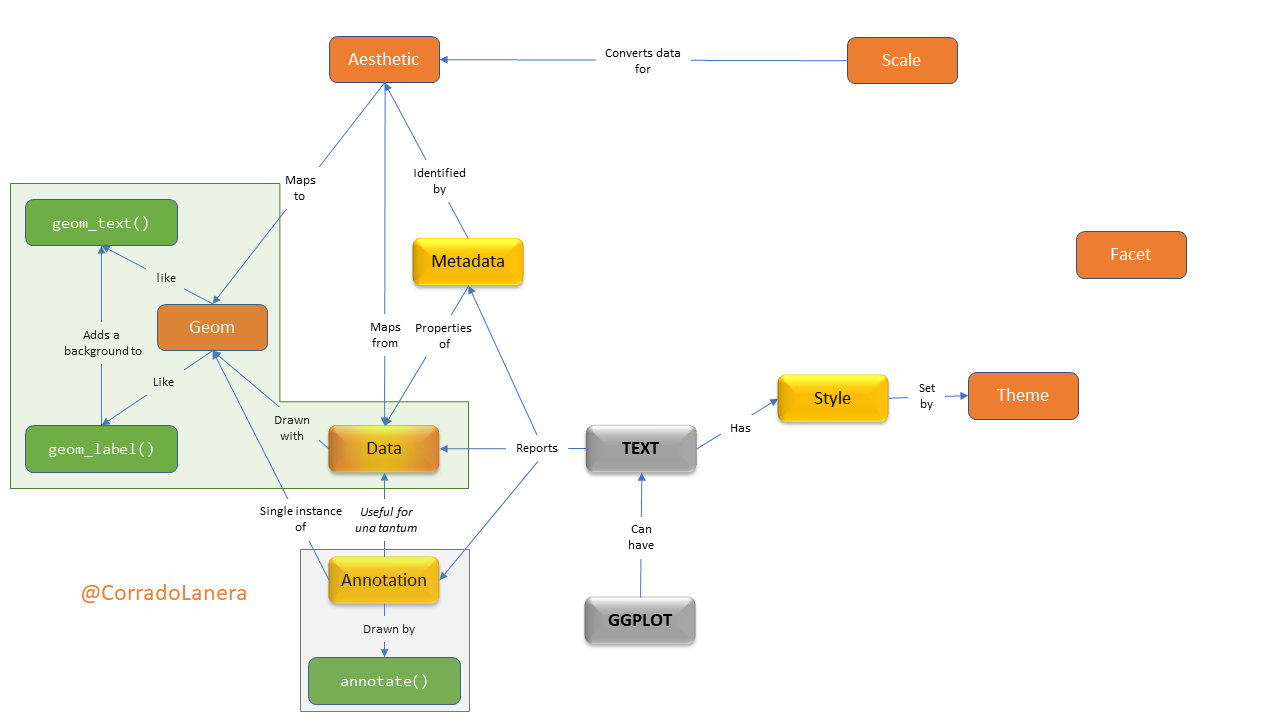 <br><br><br><br><br> <small><small><small><small>Click the timer to start the countdown</small></small></small></small> <br> ] In plots, what textual elements have driven you... .left-4col[.can-edit[.center[M] * ]] .left-4col[.can-edit[.center[A] * ]] .left-4col[.can-edit[.center[D] * ]] .left-4col[.can-edit[.center[(S) ?] * ]] ??? To start thinking about text into plots, I would like you to answer a quick question: In plots, what textual elements have driven you mad? Which are some examples you have encounter? - Directly ask to unmute and discuss if 1-5 people "Please, unmute yourself and start this two-minute discussion together." - breakout room (of ~3) if >5 people: "I will put you in break-out rooms now, and you have three minutes there to present each other in the room and create a list of examples for types of text you can encounter in a plot. Before to start, is everything clear, are there some questions? Ok, Ready: go." - Present yourself and work in pairs if in presence One person per group, please unmute themself and give us their examples. What do you think are the headers? Feel free to unmute yourself to answer. Well, before going on, has everyone one stick note? Can you show me it? Wonderfull, please put it in front of the camera to cover it every time you would like to let me know you have some questions, or for any reason, you would like to unmute yourself. --- # Text in a plot: where and how <br>  ??? In a plot you can include 3 main types of textual objects: - data, if you want to draw a textual label at each data point - meta-data, which are the properties of the data you plot or of the plot itself (like the axes labels and ticks, the legends, or the plot title) - or, you can add extra annotation, like a tag, which is not structured into the main data-set you are using. Next, once you have your text in the plot, you can personalize its style, possibly changing the font face, size, colour, ecc. One important thing to keep in mind is that style change **only how** we can see the data, not **what** data we see...it is all and only about style, not content! And that is why I put the "S" of Style in parentheses in the previous table. --- name: gg-review background-image: url(img/gg-logo.png) background-position: 90% 5% background-size: 10% # Text in {ggplot2} A `ggplot()` is made up of _layers_: <small><small>([check your bases](https://corradolanera.shinyapps.io/base-gg-checks))</small></small>  ??? As you can immagine, `{ggplot2}` can manage all these aspects taking advantage of its standard layered way to structure and define a plot. > Have you all used the basics **data**, **aesthetics**, and **geom functions** layers? (Thumbs UP) We have the data defining "what" we want to plot. The aesthetics define "which ways" we want to plot them. And geoms, that draw the plot according to the aesthetics recipes, and using the right shape and transformation of the data. > Have you ever see the other layers, reported in orange? (Thumbs UP) - You can think to a scale as the opposite of a legend: while legends serve us to understand the reality looking at the plot, scales serve us to draw the plot looking at the reality. - The facet is a side layer allowing us to replicate the rules defined for one plot stratifying it according to the data levels we have, producing a grid of plots accordingly. - Finally, the theme, simply manages all and only (!) the styles. --- name: gg-review background-image: url(img/lter_penguins.png) background-position: 90% 5% background-size: 35% # Text in {ggplot2} A `ggplot()` is made up of _layers_: .left-plot[ 1. **Data** <br> <br> <br> <br> <br> <br> ] .right-code[ .center[Artwork by @allison_horst] ```r library(tidyverse) library(palmerpenguins) *penguins %>% glimpse() ``` ``` Rows: 344 Columns: 8 $ species <fct> Adelie, Adelie, Adelie, Adelie… $ island <fct> Torgersen, Torgersen, Torgerse… $ bill_length_mm <dbl> 39.1, 39.5, 40.3, NA, 36.7, 39… $ bill_depth_mm <dbl> 18.7, 17.4, 18.0, NA, 19.3, 20… $ flipper_length_mm <int> 181, 186, 195, NA, 193, 190, 1… $ body_mass_g <int> 3750, 3800, 3250, NA, 3450, 36… $ sex <fct> male, female, female, NA, fema… $ year <int> 2007, 2007, 2007, 2007, 2007, … ``` ] ??? So we can start. The first thing to do is to keep some data. Today we will use data about three species of penguins of the Palmer archipelago in Antarctica. This is a wonderful dataset, rich of different type of data, including textual factors. Once we have data, the next step is to define what we want to see in the plot; that in `{ggplot2}` words, this means to define the aesthetics maps. --- name: gg-review background-image: url(img/culmen_depth.png) background-position: 90% 5% background-size: 35% # Text in {ggplot2} A `ggplot()` is made up of _layers_: .left-plot[ 1. Data 2. **Aesthetics** <br> <br> <br> <br> <br> <img src="index_files/figure-html/gg-aes-out-1.png" width="100%" /> ] .right-code[ .center[Artwork by @allison_horst] ```r penguins %>% ggplot(aes(x = bill_length_mm, y = bill_depth_mm, * label = sex, colour = species)) ``` ] ??? Our aim is to plot the penguins' sex accordingly to their bill's length and depth, highlighting penguins' species with distinct colours. Hence, we need to set the corresponding aesthetics accordingly. In particular, we use the key "label" to define which variable `ggplot()` should use for the textual data to represent, and we set other aesthetics (like x, y, and colour) as usual for a ggplot. As we can see, simply defining the aesthetics maps, the axes' titles are already set too, as well as the plot's coordinate-grid. Anyway anything is drawing yet, so no colour and the corresponding legend either. --- # Text in a plot: `geom_*()`etrical usage <br>  ??? Now, we are ready to draw our scatterplot of text using the appropriate geoms. For text, the geoms we can use are the `geom_text()` or the `geom_label()`. The last one is different from the first simply because it adds a coloured rectangle background, 