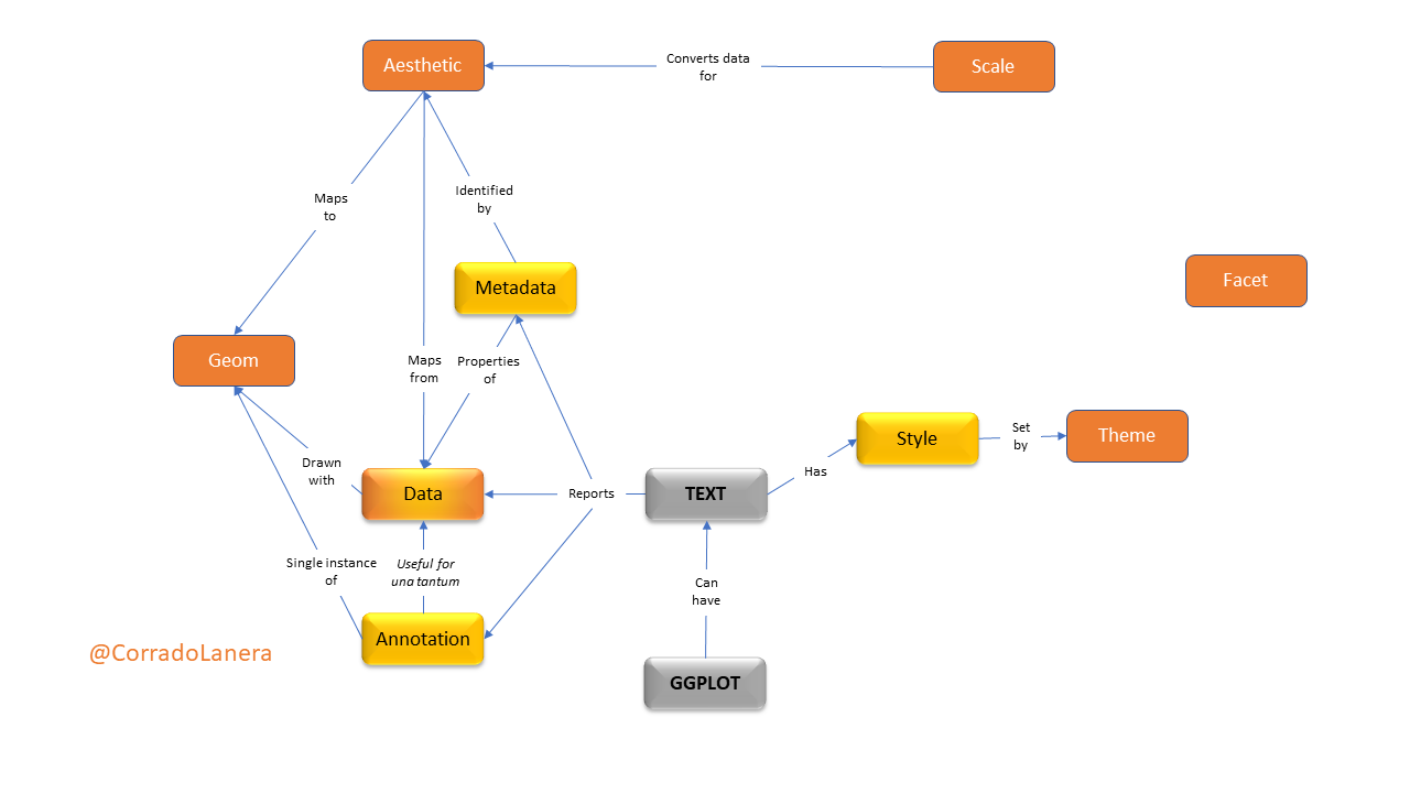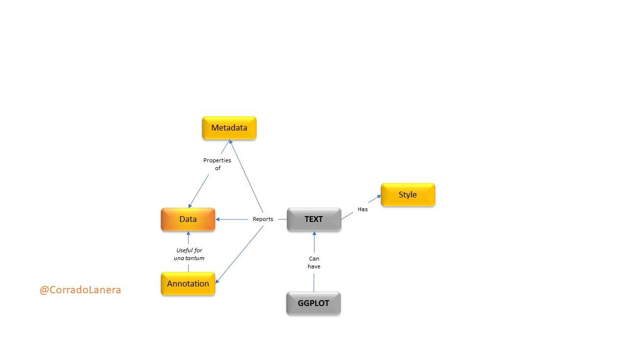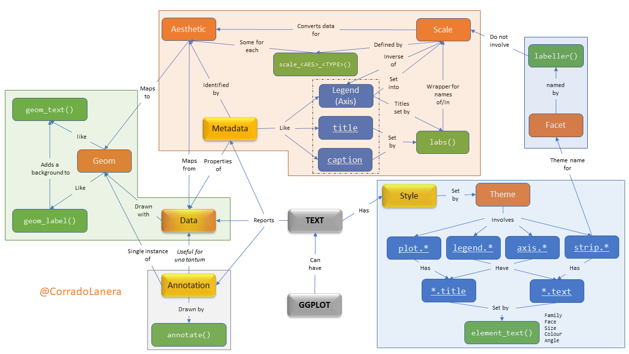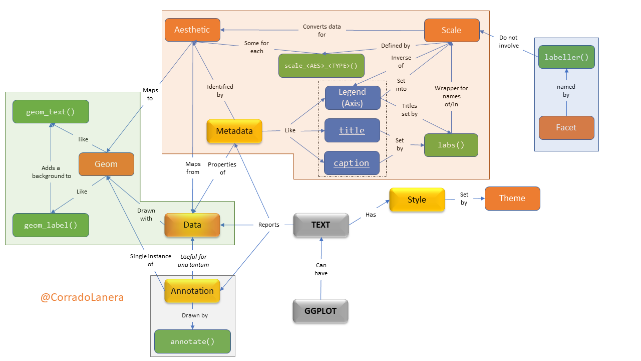 <br><br><br><br><br> <small><small><small><small>Click the timer to start the countdown</small></small></small></small> <br> ] In plots, what textual elements have driven you... .left-4col[.can-edit[.center[M] * ]] .left-4col[.can-edit[.center[A] * ]] .left-4col[.can-edit[.center[D] * ]] .left-4col[.can-edit[.center[(S) ?] * ]] ??? To start thinking about text into plots, I would like you to answer a quick question: In plots, what textual elements have driven you mad? Which are some examples you have encounter? - Directly ask to unmute and discuss if 1-5 people "Please, unmute yourself and start this two-minute discussion together." - breakout room (of ~3) if >5 people: "I will put you in break-out rooms now, and you have three minutes there to present each other in the room and create a list of examples for types of text you can encounter in a plot. Before to start, is everything clear, are there some questions? Ok, Ready: go." - Present yourself and work in pairs if in presence One person per group, please unmute themself and give us their examples. What do you think are the headers? Feel free to unmute yourself to answer. Well, before going on, has everyone one stick note? Can you show me it? Wonderfull, please put it in front of the camera to cover it every time you would like to let me know you have some questions, or for any reason, you would like to unmute yourself. --- # Text in a plot: where and how <br>  ??? In a plot you can include 3 main types of textual objects: - data, if you want to draw a textual label at each data point - meta-data, which are the properties of the data you plot or of the plot itself (like the axes labels and ticks, the legends, or the plot title) - or, you can add extra annotation, like a tag, which is not structured into the main data-set you are using. Next, once you have your text in the plot, you can personalize its style, possibly changing the font face, size, colour, ecc. One important thing to keep in mind is that style change **only how** we can see the data, not **what** data we see...it is all and only about style, not content! And that is why I put the "S" of Style in parentheses in the previous table. --- name: gg-review background-image: url(img/gg-logo.png) background-position: 90% 5% background-size: 10% # Text in {ggplot2} A `ggplot()` is made up of _layers_: <small><small>([check your bases](https://corradolanera.shinyapps.io/base-gg-checks))</small></small>  ??? As you can immagine, `{ggplot2}` can manage all these aspects taking advantage of its standard layered way to structure and define a plot. > Have you all used the basics **data**, **aesthetics**, and **geom functions** layers? (Thumbs UP) We have the data defining "what" we want to plot. The aesthetics define "which ways" we want to plot them. And geoms, that draw the plot according to the aesthetics recipes, and using the right shape and transformation of the data. > Have you ever see the other layers, reported in orange? (Thumbs UP) - You can think to a scale as the opposite of a legend: while legends serve us to understand the reality looking at the plot, scales serve us to draw the plot looking at the reality. - The facet is a side layer allowing us to replicate the rules defined for one plot stratifying it according to the data levels we have, producing a grid of plots accordingly. - Finally, the theme, simply manages all and only (!) the styles. --- name: gg-review background-image: url(img/lter_penguins.png) background-position: 90% 5% background-size: 35% # Text in {ggplot2} A `ggplot()` is made up of _layers_: .left-plot[ 1. **Data** <br> <br> <br> <br> <br> <br> ] .right-code[ .center[Artwork by @allison_horst] ```r library(tidyverse) library(palmerpenguins) *penguins %>% glimpse() ``` ``` Rows: 344 Columns: 8 $ species <fct> Adelie, Adelie, Adelie, Adelie… $ island <fct> Torgersen, Torgersen, Torgerse… $ bill_length_mm <dbl> 39.1, 39.5, 40.3, NA, 36.7, 39… $ bill_depth_mm <dbl> 18.7, 17.4, 18.0, NA, 19.3, 20… $ flipper_length_mm <int> 181, 186, 195, NA, 193, 190, 1… $ body_mass_g <int> 3750, 3800, 3250, NA, 3450, 36… $ sex <fct> male, female, female, NA, fema… $ year <int> 2007, 2007, 2007, 2007, 2007, … ``` ] ??? So we can start. The first thing to do is to keep some data. Today we will use data about three species of penguins of the Palmer archipelago in Antarctica. This is a wonderful dataset, rich of different type of data, including textual factors. Once we have data, the next step is to define what we want to see in the plot; that in `{ggplot2}` words, this means to define the aesthetics maps. --- name: gg-review background-image: url(img/culmen_depth.png) background-position: 90% 5% background-size: 35% # Text in {ggplot2} A `ggplot()` is made up of _layers_: .left-plot[ 1. Data 2. **Aesthetics** <br> <br> <br> <br> <br> <img src="index_files/figure-html/gg-aes-out-1.png" width="100%" /> ] .right-code[ .center[Artwork by @allison_horst] ```r penguins %>% ggplot(aes(x = bill_length_mm, y = bill_depth_mm, * label = sex, colour = species)) ``` ] ??? Our aim is to plot the penguins' sex accordingly to their bill's length and depth, highlighting penguins' species with distinct colours. Hence, we need to set the corresponding aesthetics accordingly. In particular, we use the key "label" to define which variable `ggplot()` should use for the textual data to represent, and we set other aesthetics (like x, y, and colour) as usual for a ggplot. As we can see, simply defining the aesthetics maps, the axes' titles are already set too, as well as the plot's coordinate-grid. Anyway anything is drawing yet, so no colour and the corresponding legend either. --- # Text in a plot: `geom_*()`etrical usage <br>  ??? Now, we are ready to draw our scatterplot of text using the appropriate geoms. For text, the geoms we can use are the `geom_text()` or the `geom_label()`. The last one is different from the first simply because it adds a coloured rectangle background, 